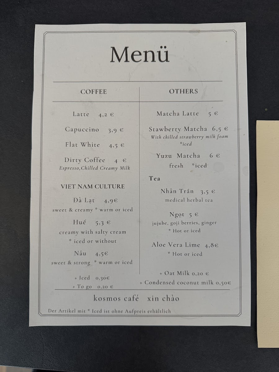 Welcome to kosmos café, a delightful gem nestled in the heart of Dresden at Obergraben 10. This Vietnamese-inspired café elevates the coffee experience with a unique twist, blending traditional flavors with contemporary flair. Customers rave about the specialty coffee, highlighting the exquisite Vietnamese drip and innovative drinks, such as the espresso yuzu, which pushes the boundaries of conventional coffee enjoyment.